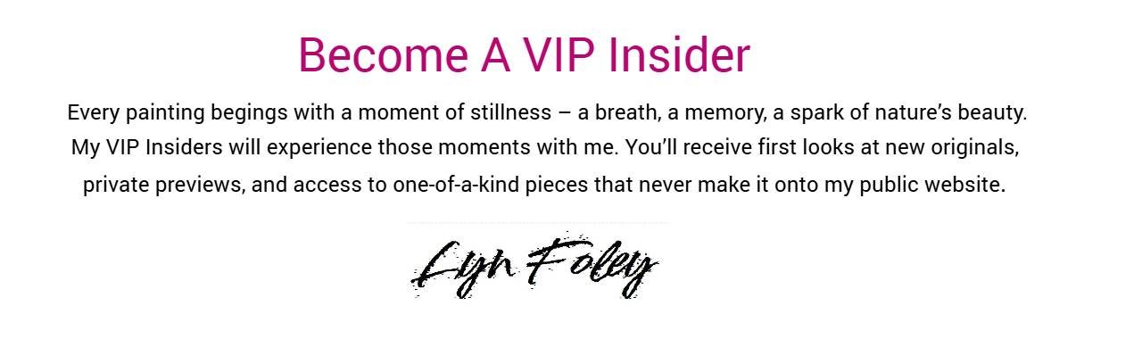 Every painting begings with a moment of stillness – a breath, a memory, a spark of nature’s beauty. My VIP Insiders g]et to experience those moments with me. You’ll receive first looks at new originals, private previews, and access to one-of-a-kind pieces that never make it onto my public website.
